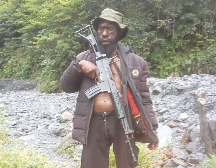 Botak Wanimbo pegang senjata api hasil rampas milik Militer Indonesia di Kabupaten Tolikara Papua Pegunungan (Dok. TPNPB)